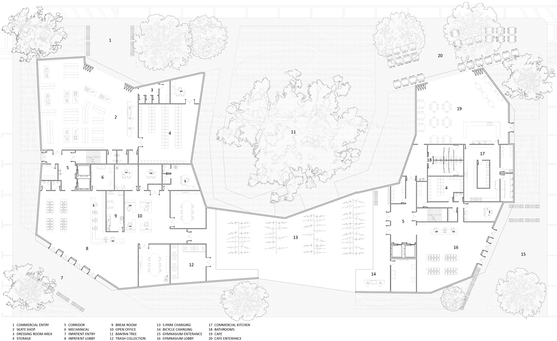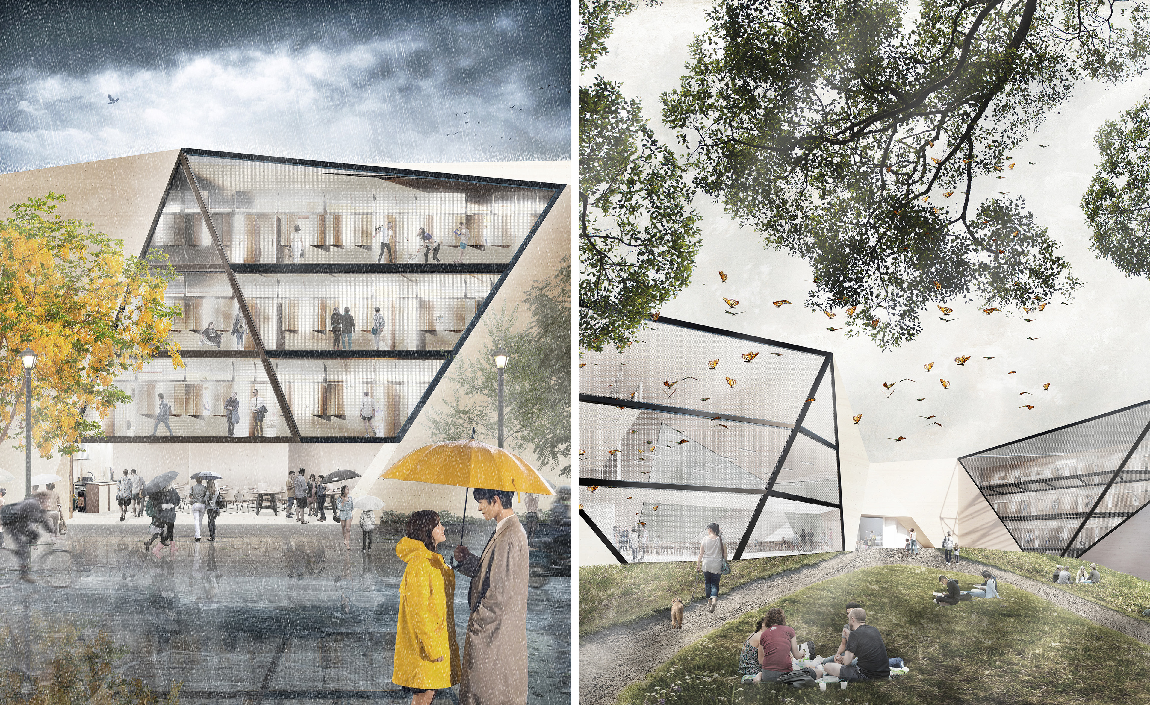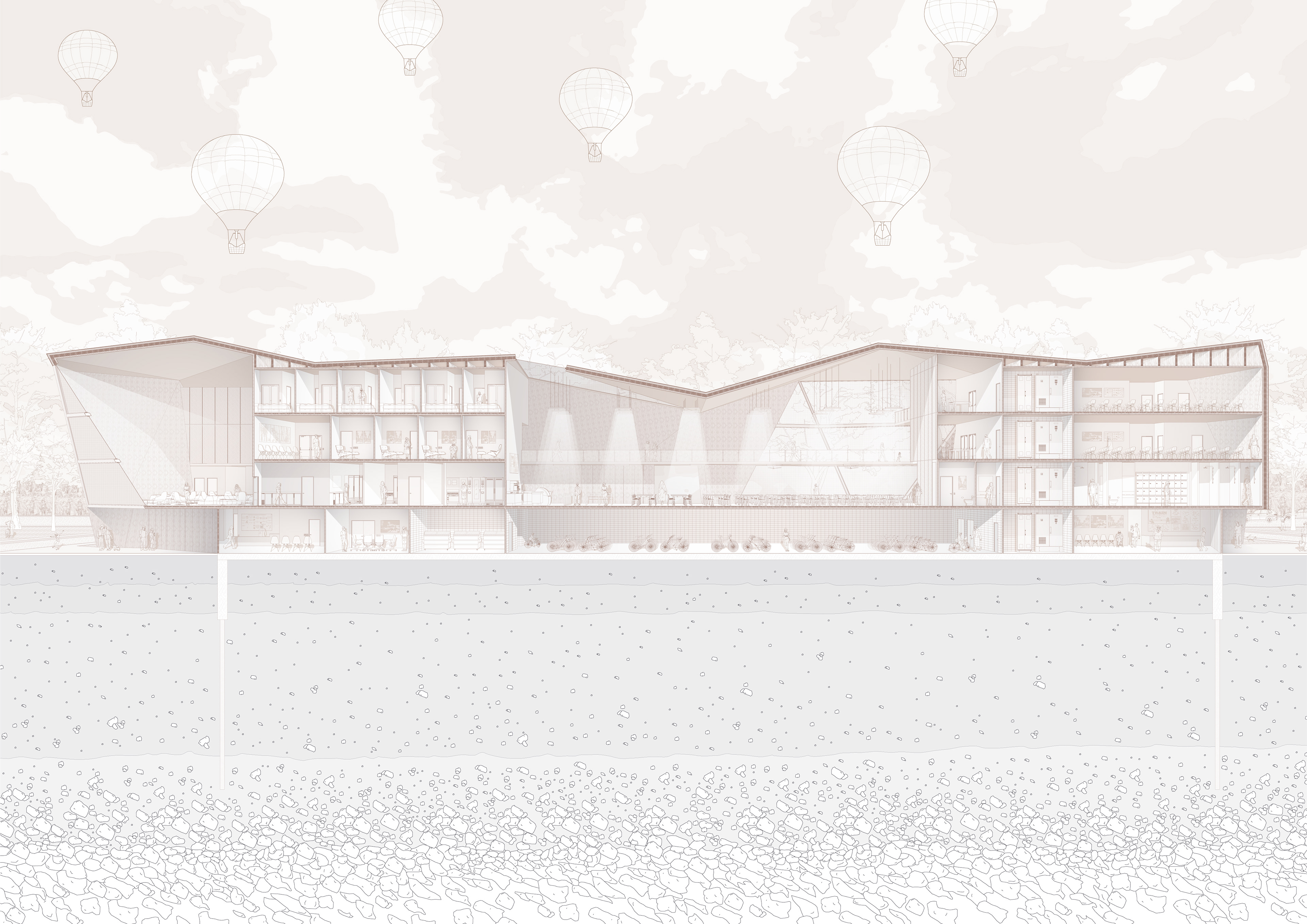 As a mental health healing ground, ae inpatient is both a community center and youth inpatient facility. Ae inpatient is inspired by the nature of recovery through mental illnesses itself, with a rigid, oppressive exterior structure that represents the beginning stages of depression and an expansive, healing interior representing the beginning stages of recovery. Triangular panels were chosen to redirect the view of pedestrians and patients towards the edges of their view frame, to move their eyes up. On the outside, these panels expand the building’s envelope to encroach on the public space. A feeling of discomfort and smallness is felt by those on a pedestrian scale, which symbolizes the first stages of a mental illness. As someone walks into the space, it is bright and healing, which symbolizes the treatment itself patients receive.
