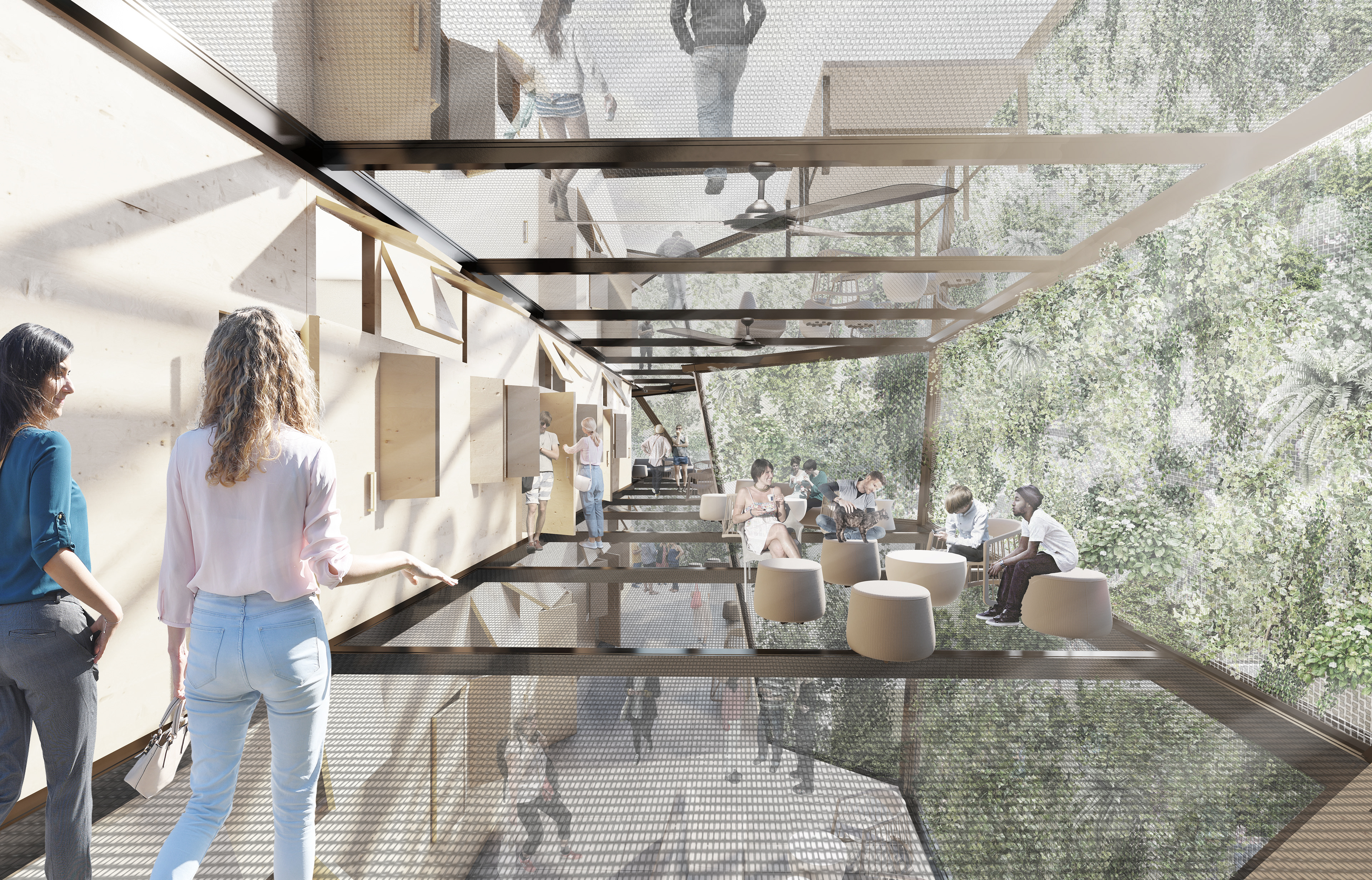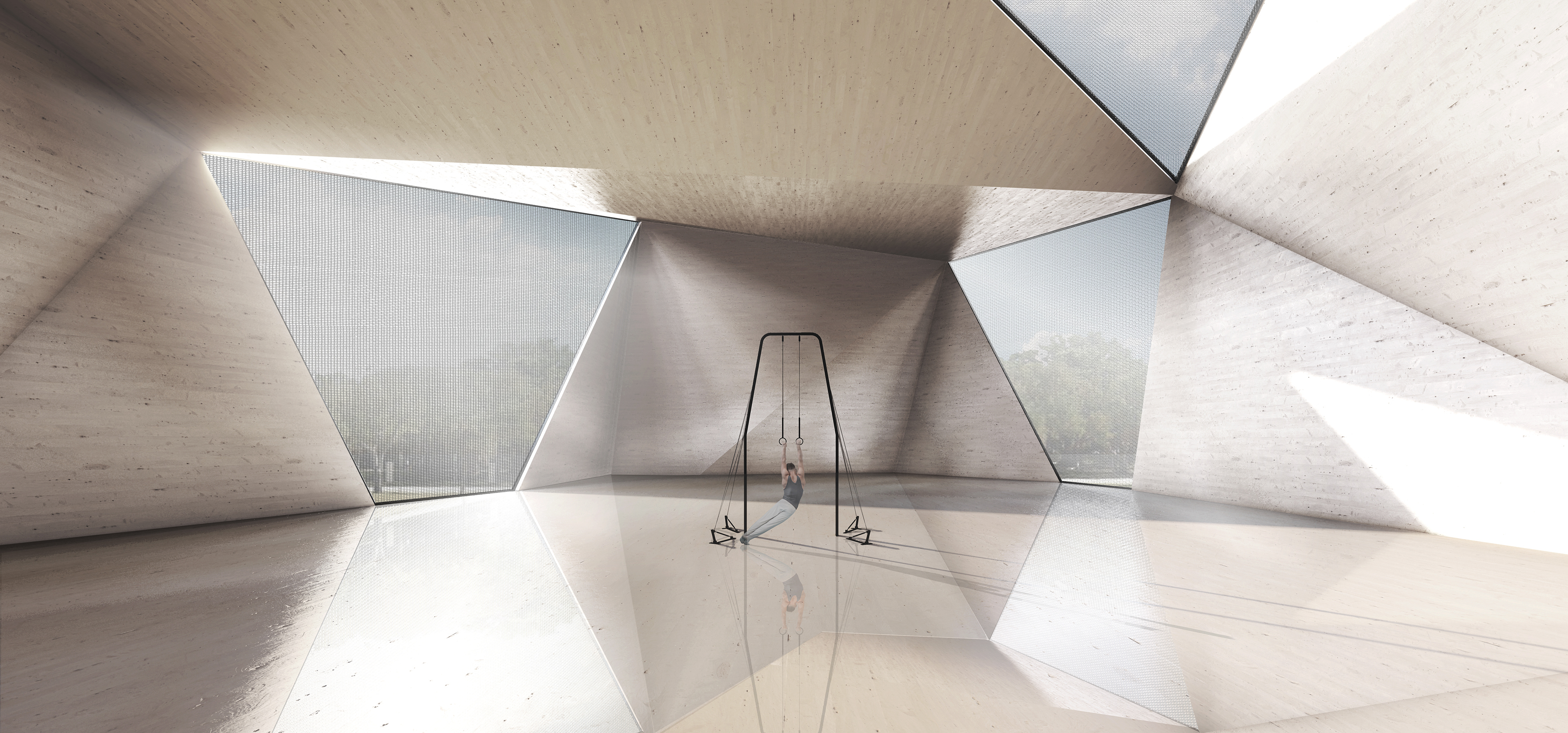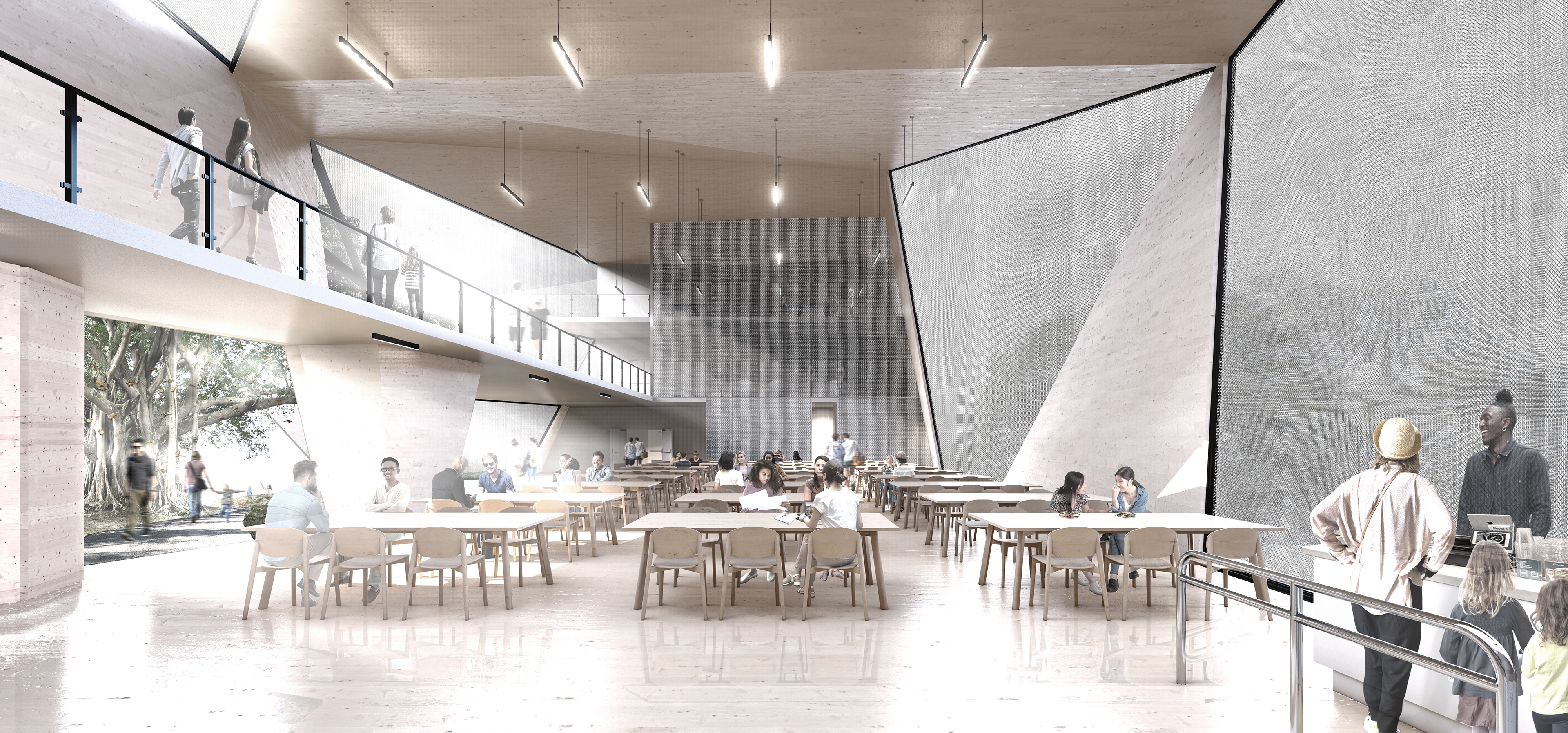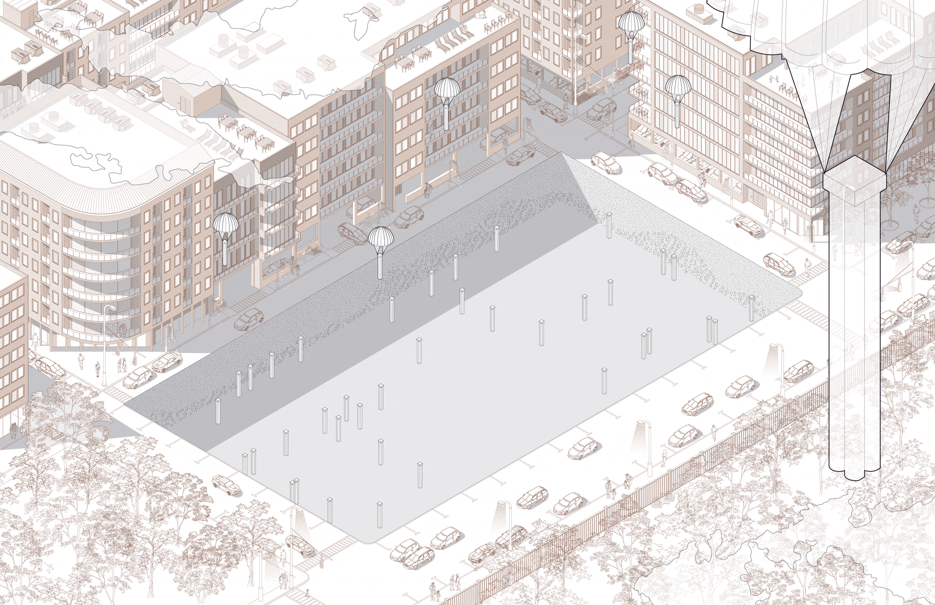 As a mental health healing ground, ae inpatient is both a community center and youth inpatient facility. Ae inpatient is inspired by the nature of recovery through mental illnesses itself, with a rigid, oppressive exterior structure that represents the beginning stages of depression and an expansive, healing interior representing the beginning stages of recovery. Triangular panels were chosen to redirect the view of pedestrians and patients towards the edges of their view frame, to move their eyes up. On the outside, these panels expand the building’s envelope to encroach on the public space. A feeling of discomfort and smallness is felt by those on a pedestrian scale, which symbolizes the first stages of a mental illness. As someone walks into the space, it is bright and healing, which symbolizes the treatment itself patients receive.