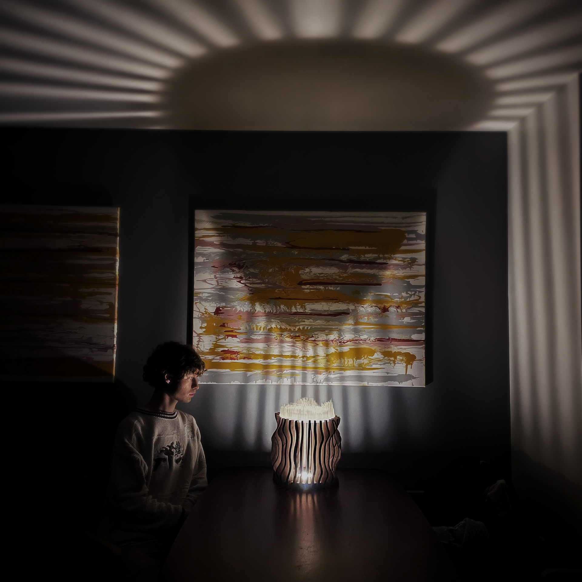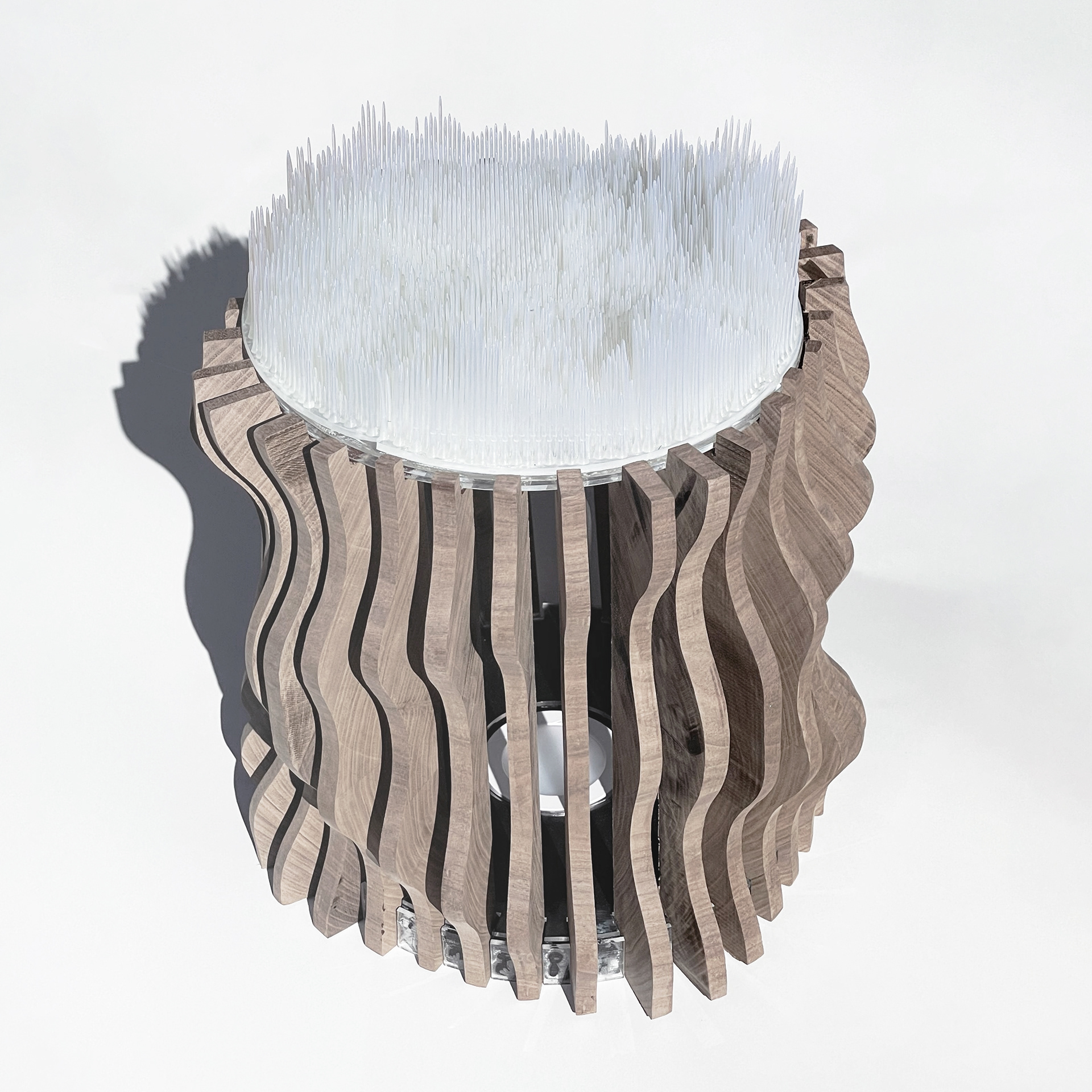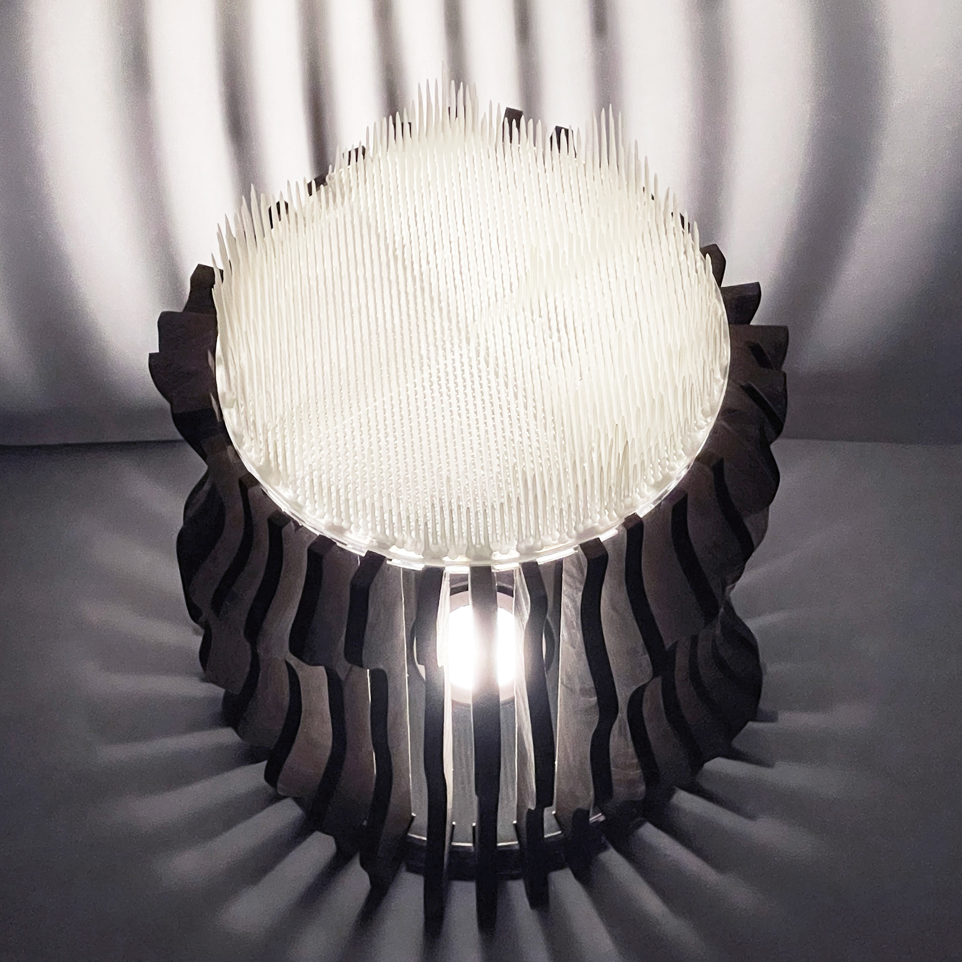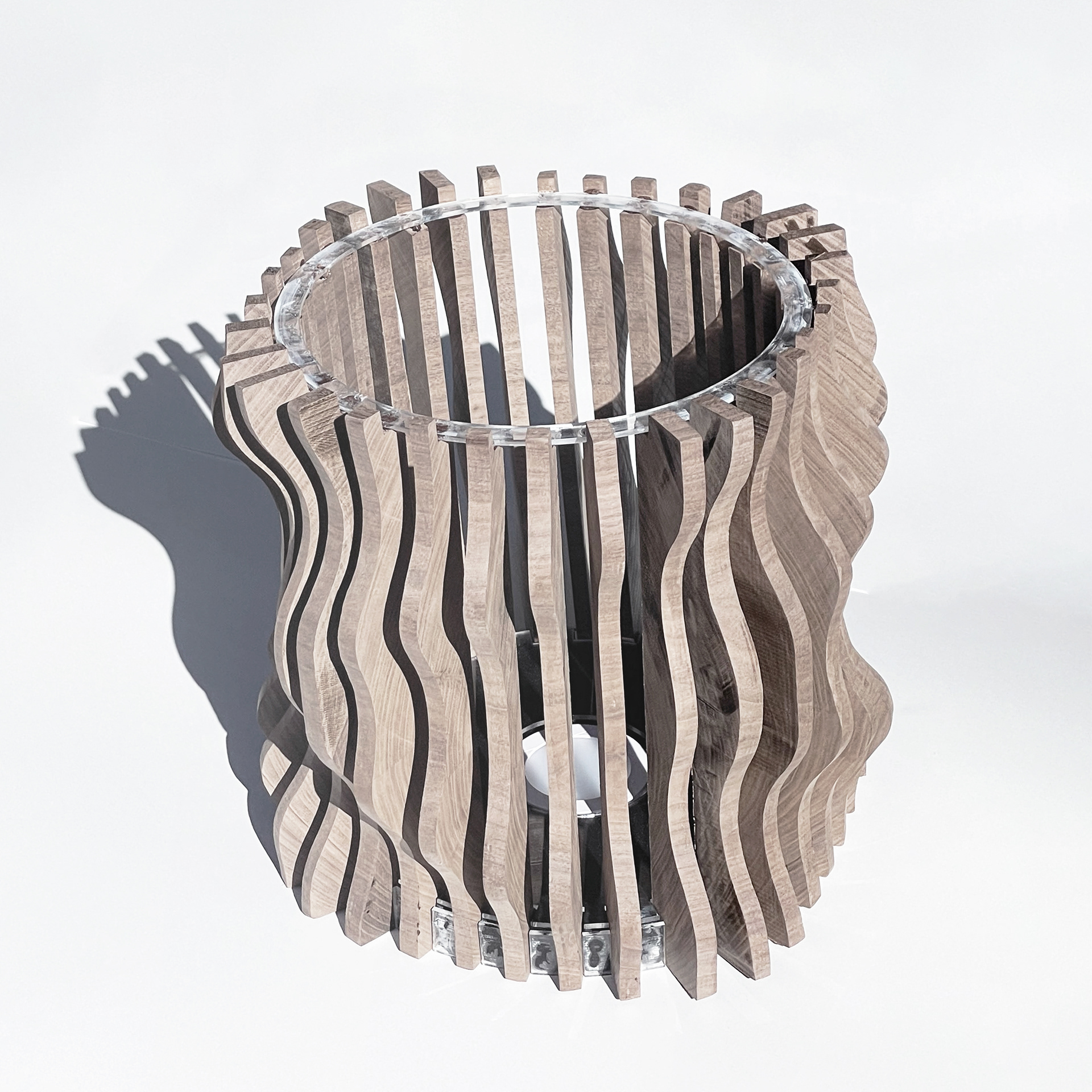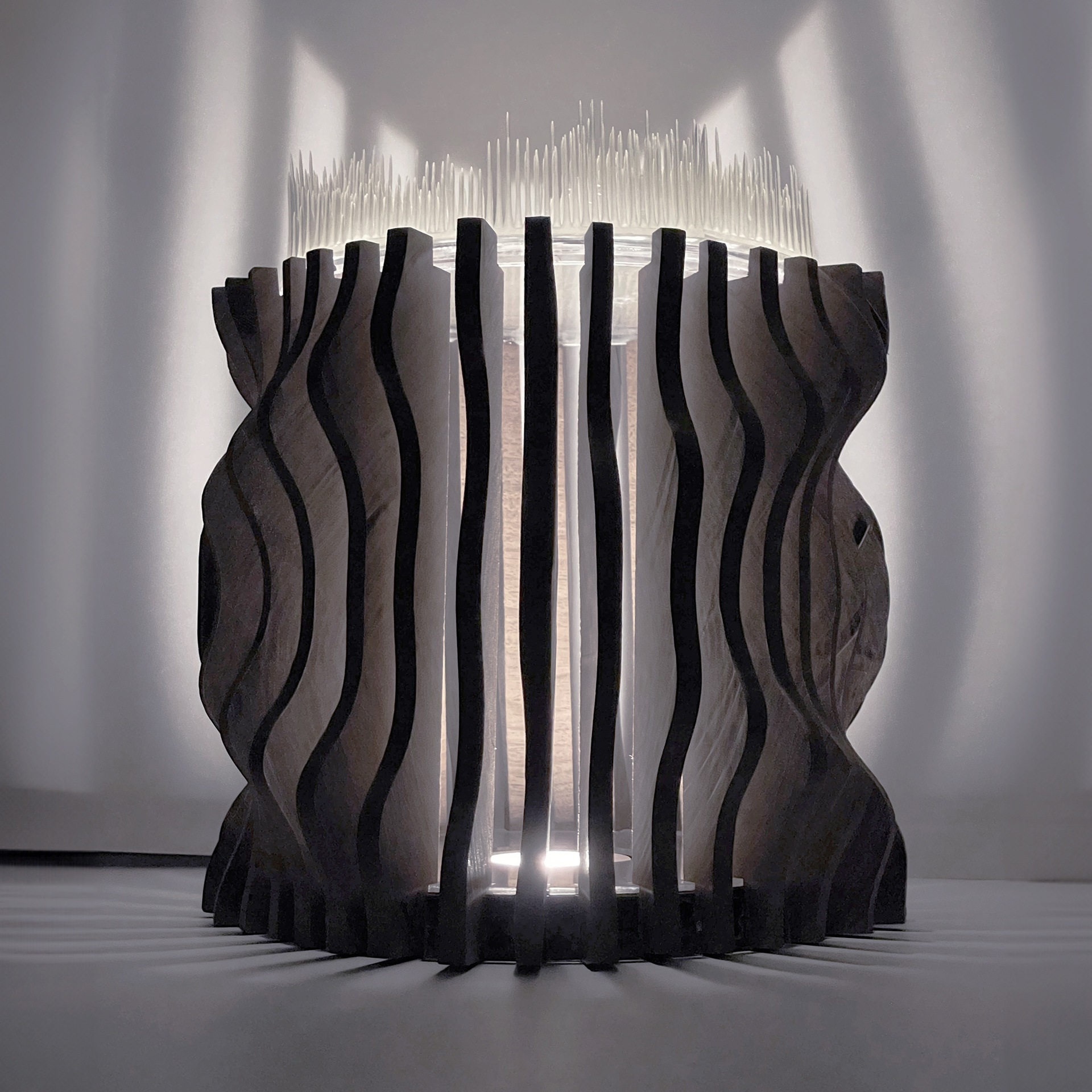 Filtered / Framed Light is a lamp sculpture that contrasts two methods of blocking light: diffusion through permeability and interruption through deliberate obstruction. A translucent resin element softens and disperses illumination, while contoured mahogany legs impose constraint, producing sharp, extended shadows. Together, these conditions reveal how material density, geometry, and orientation govern the behavior of light.