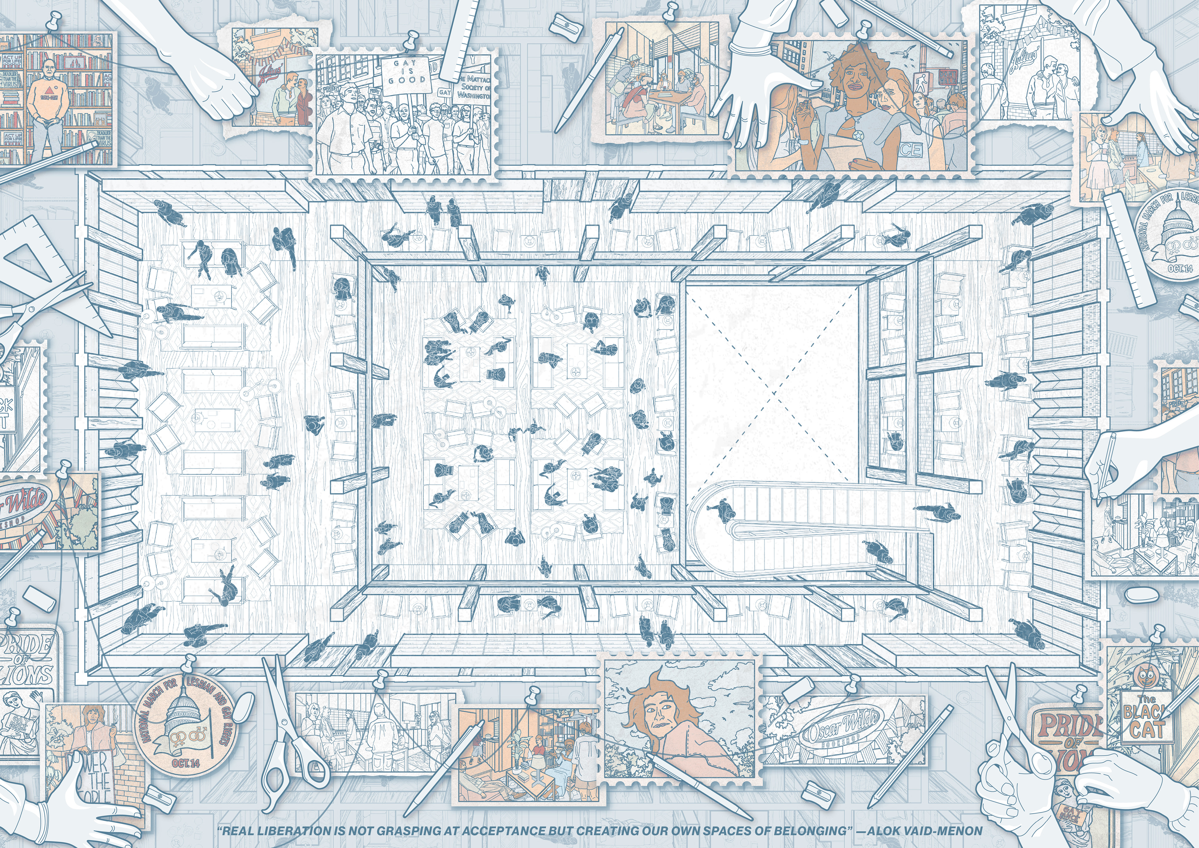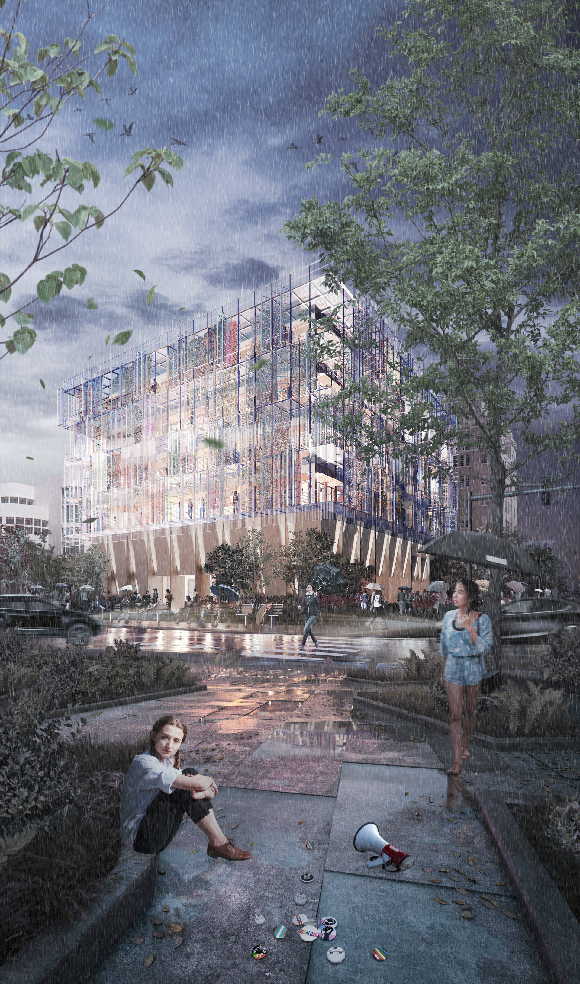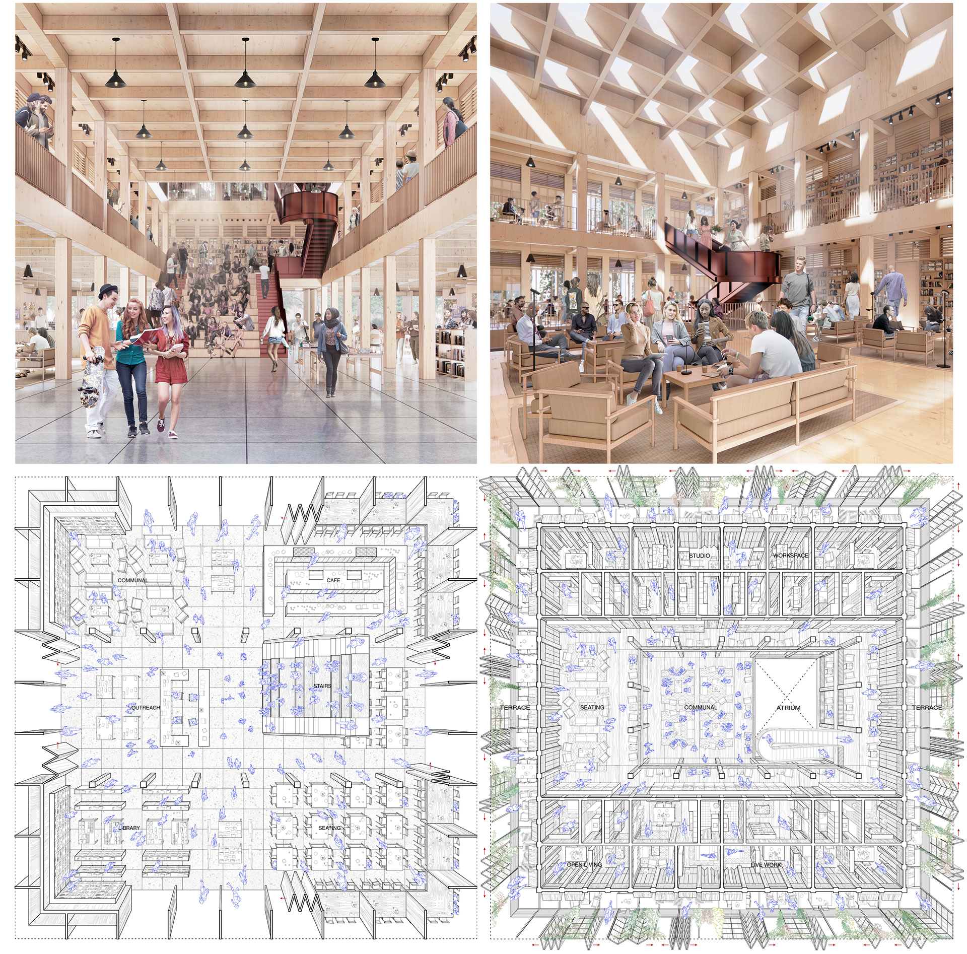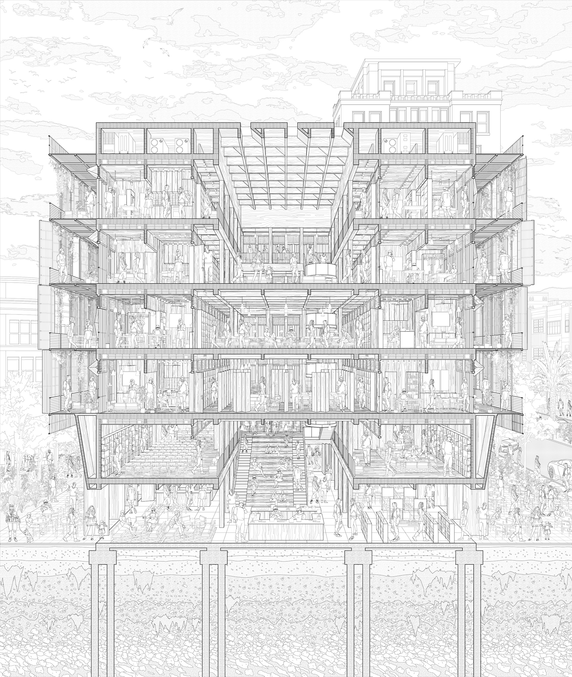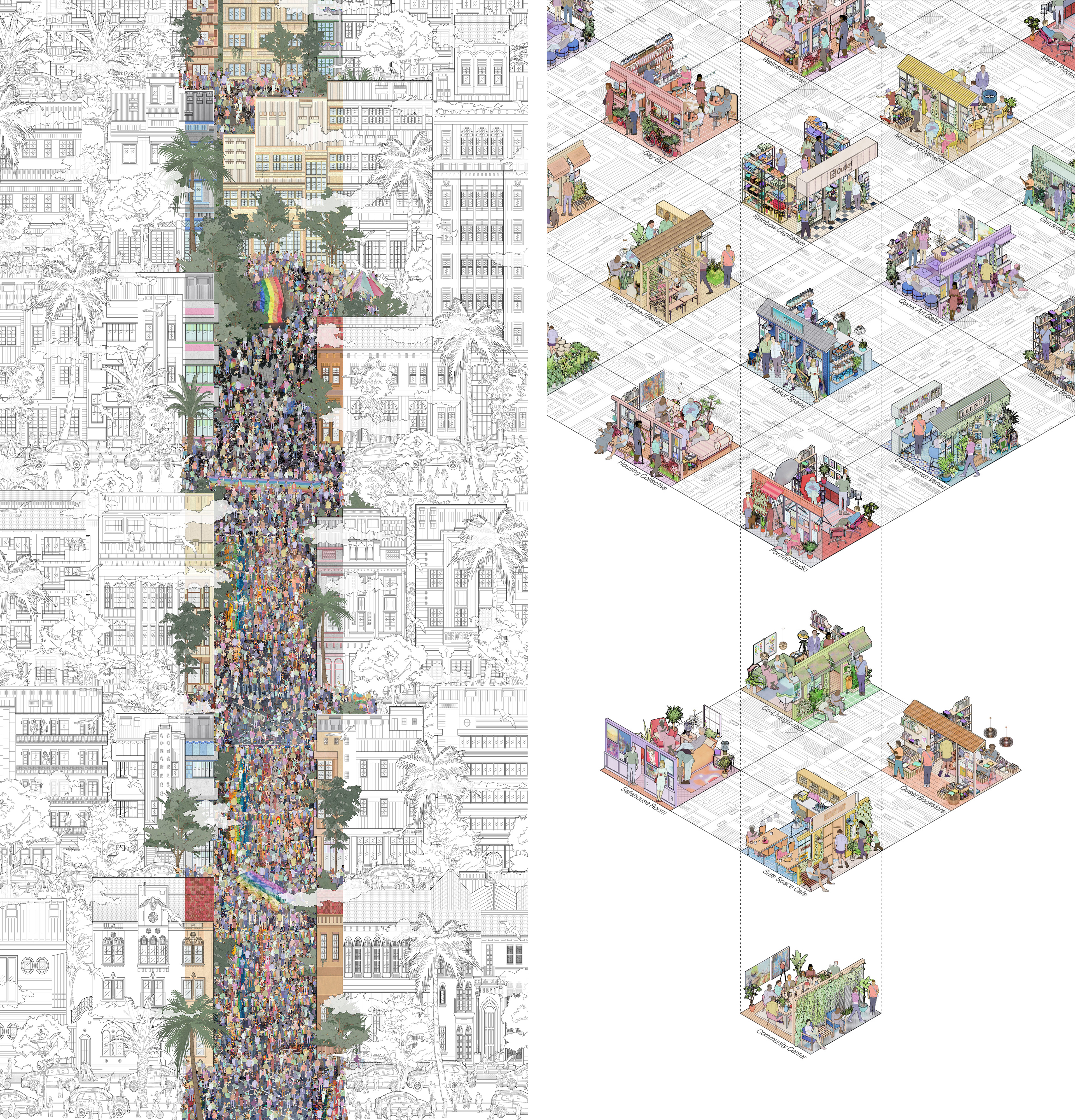A design for a collective in South Beach, Miami, utilizes programmatic organization as a tool to shape social interaction. By choreographing a mix of units, workspaces, communal kitchens, and shared terraces, the design arranges a queer economy of care that fosters both transparency and everyday negotiation. Drawing on Michael Warner’s framing that “queer struggles aim not just at inclusion but at a rethinking of the world’s arrangements,” the architecture opposes rainbow capitalism by physically fostering interdependence. Cross-laminated timber construction anchors this new social framework in sustainable material logic, connecting it to Florida’s native pine forests.